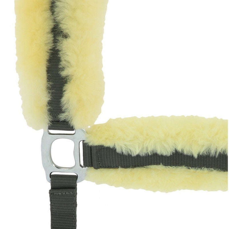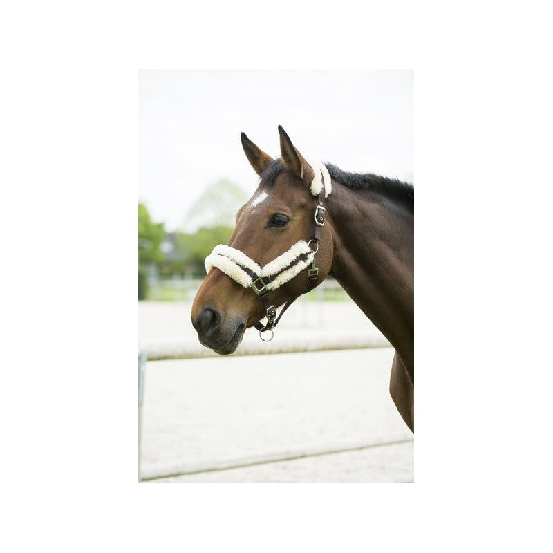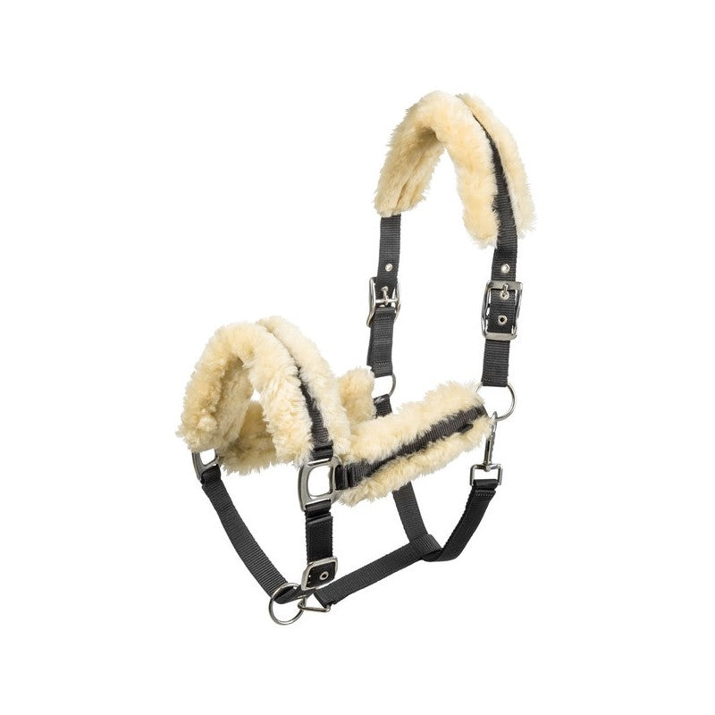 Cabezada de cuadra de polipropileno de doble espesor con tacto suave, testera, montantes y muserola forrados de borreguillo natural.