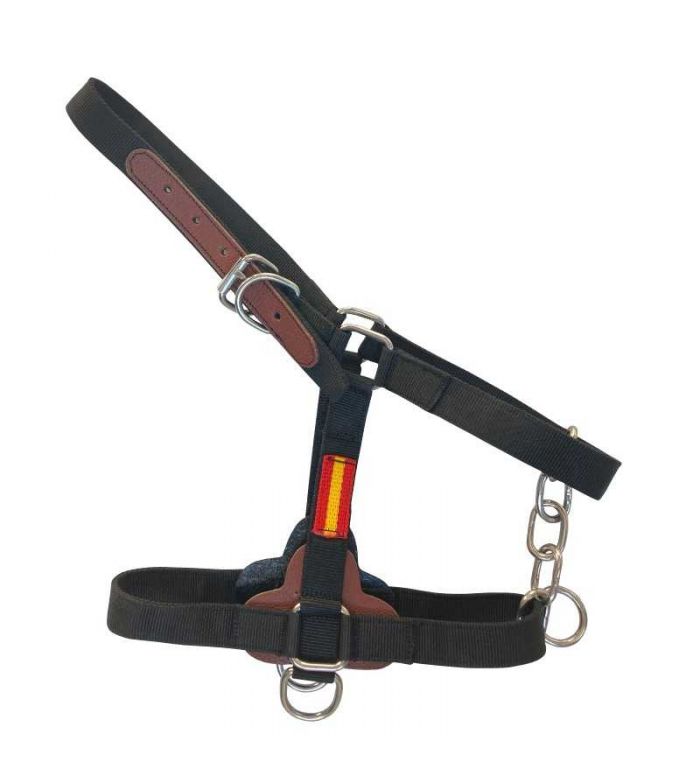 Cabezada de Cuadra con Cadena, cabezada de cuadra realizada en nylon fuerte y resistente de 30 mm de ancho con refuerzos en hebilla y cuadradillos. Decorada con bandera de España a ambos lados. Hebilla de regulación en la correa superior. Dos piquetes. Tamaño full. Color negro con la bandera de España. Excelente relación calidad/precio.