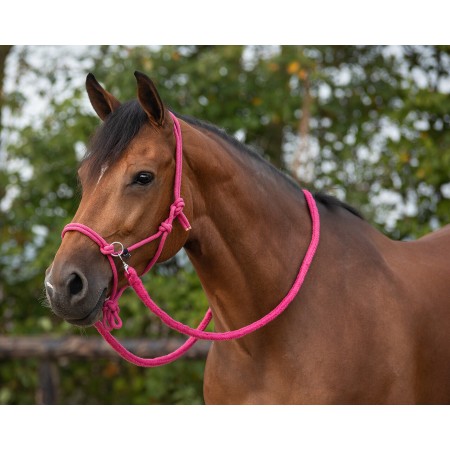 Cabezada de cuadra de cuerda, muy versátil, que se puede usar para trabajo pie a tierra o para montar sin embocadura. Este modelo dispone de dos anillas de metal y se sirve con una cuerda gruesa con dos clips para usar como riendas.