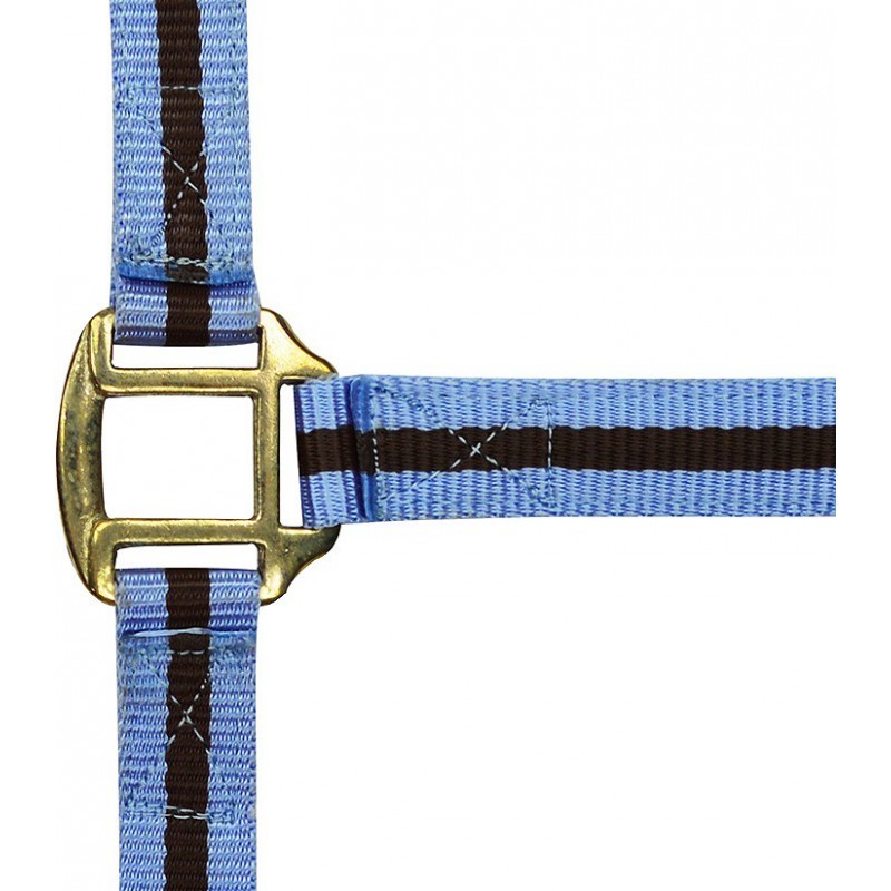 Cabezada de cuadra de nylon triple con muserola y testera ajustables y forradas de cuero de búfalo negro. Hebillaje metálico dorado.