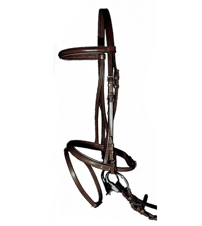 Cabezada de Cuero Riendas de Lona Tattini, fabricada con cuero Europeo. Frontalera y Muserola Inglesa perfilados, riendas de lona, hebillaje de acero inoxidable. Cierra-Boca fácil de poner y quitar. Línea económica.
