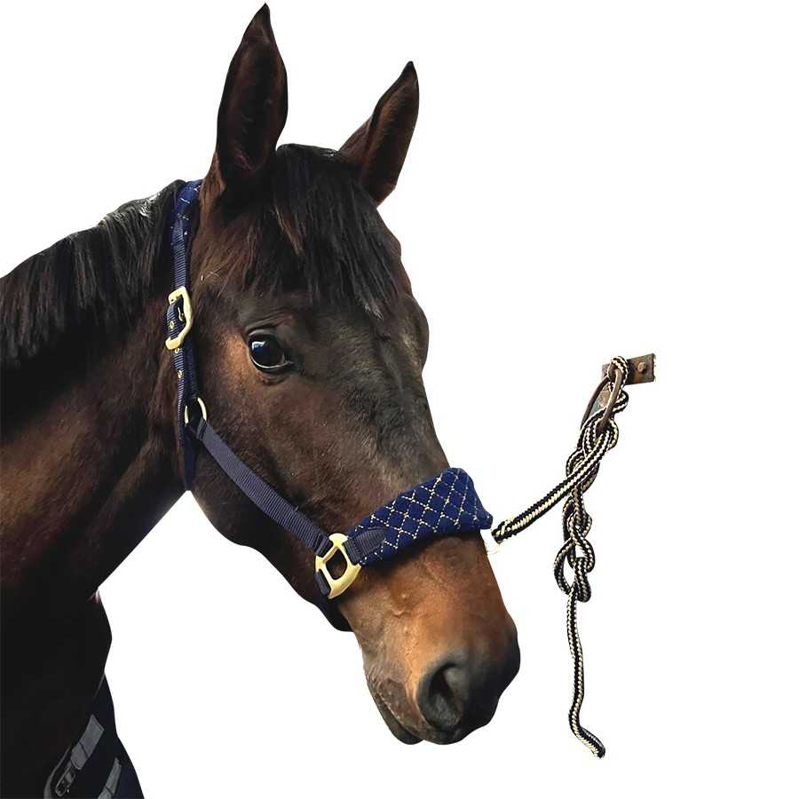 - Zona del testero y muserola recubierta de tejido polar muy suave y decorado con hilo dorado en patrón de rombos