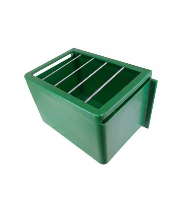 Comedero para Heno+Rejilla Galvanizada, comedero de caballo para ración diaria, evita desperdicios y permite humedecer el heno. Se fija al soporte de pared. Rejilla desmontable, desliza en los laterales. Material: Polietileno y rejilla de acero galvanizado. Dimensiones: 61,5 x 39 x 38 cm. Capacidad: 70 litros. Se vende sin tornillos.