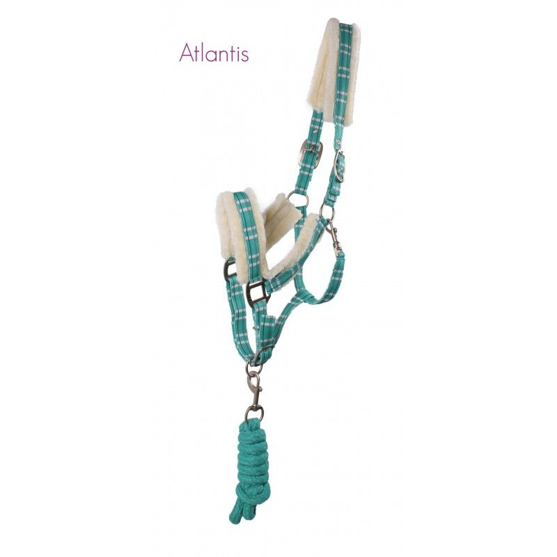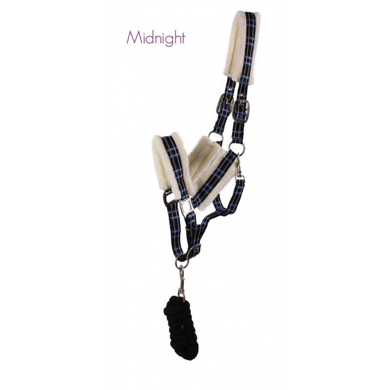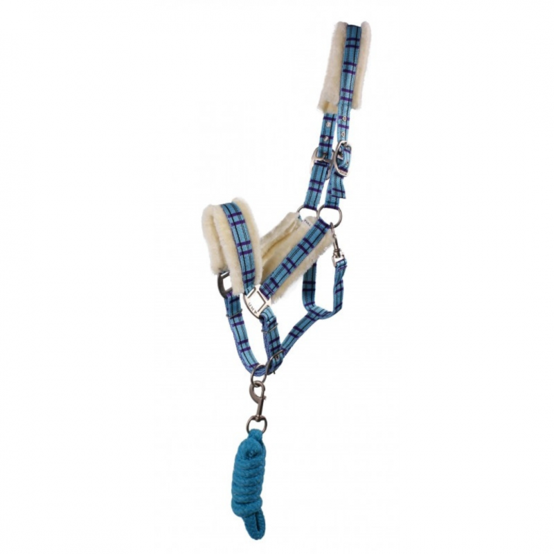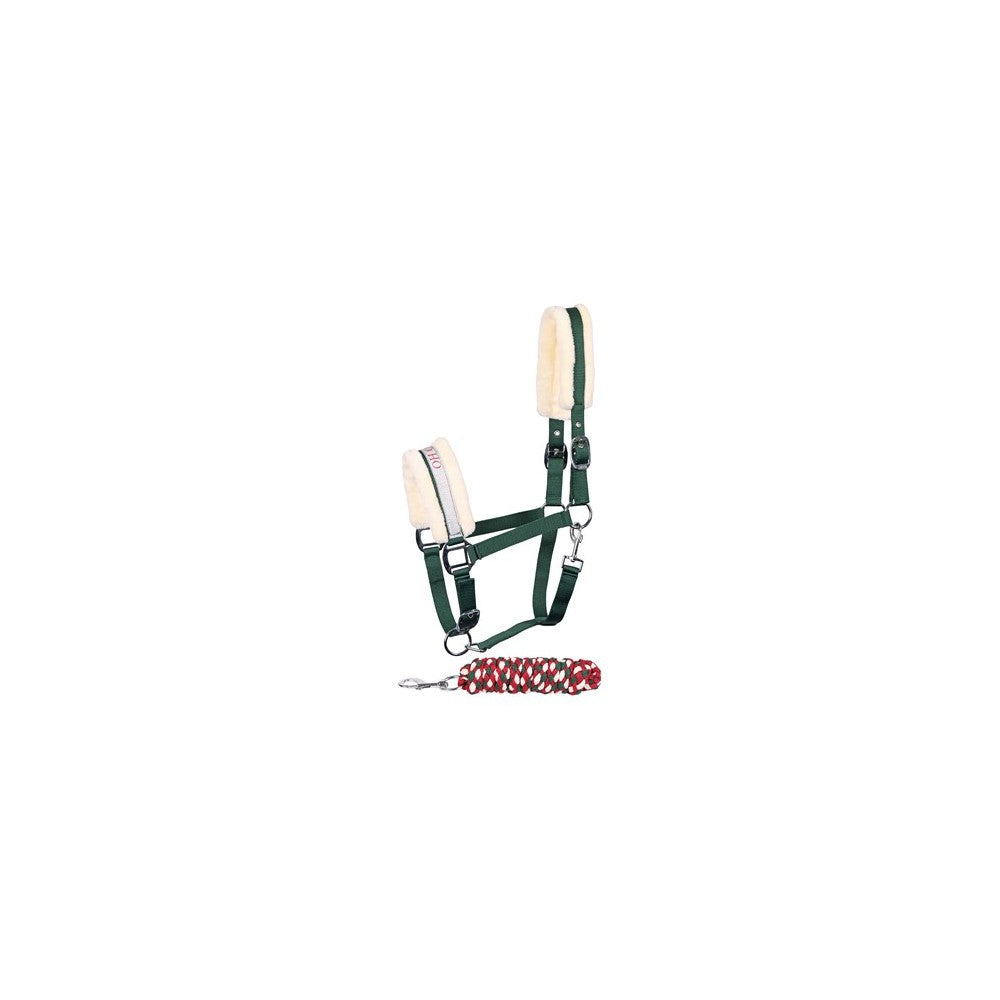 Conjunto formado por una cabezada de cuadra totalmente forrada de borreguillo sintético, ajustable en ambos lados y cierre rápido con mosquetón en el ahogadero y un ramal a conjunto. Entregada en una bolsa.