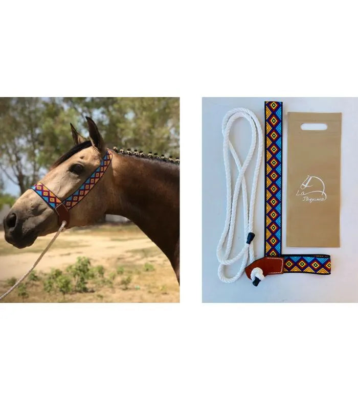Cabezada de Cuadra Étnica Guanche, fabricada con cintas de nylon (38mm ó 50mm) unidas por piel de ternera color avellana e hilo encerado. Ramal de cuerda trenzada color blanco (2m) terminada con embellecedores negros en ambas puntas.