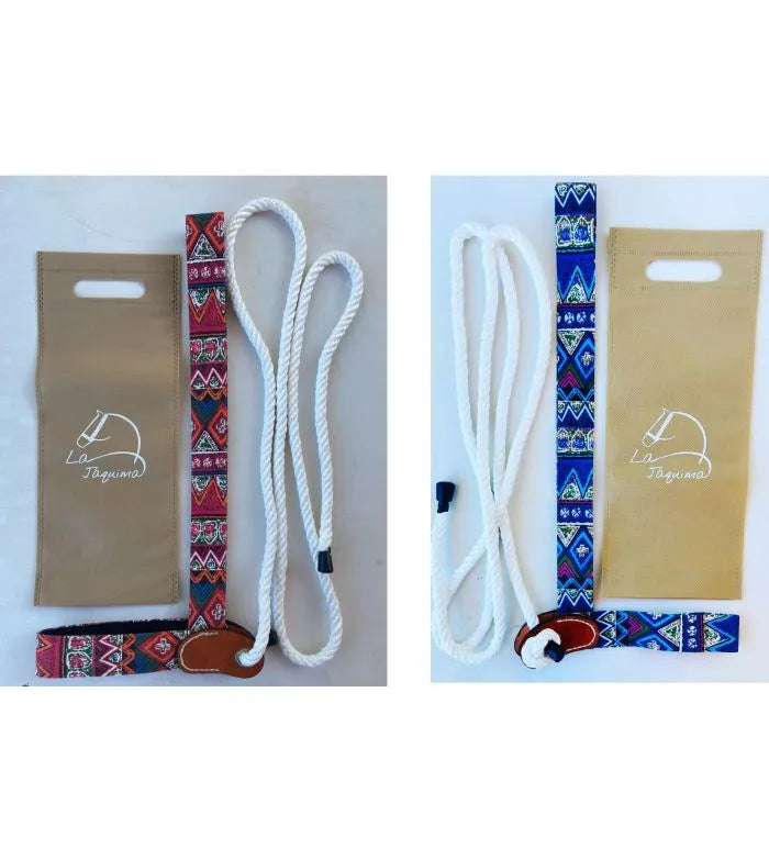 Cabezada de Cuadra Étnica Nómada, fabricada con cintas de nylon (38mm ó 50mm) unidas por piel de ternera color avellana e hilo encerado. Ramal de cuerda trenzada color blanco (2m) terminada con embellecedores negros en ambas puntas.