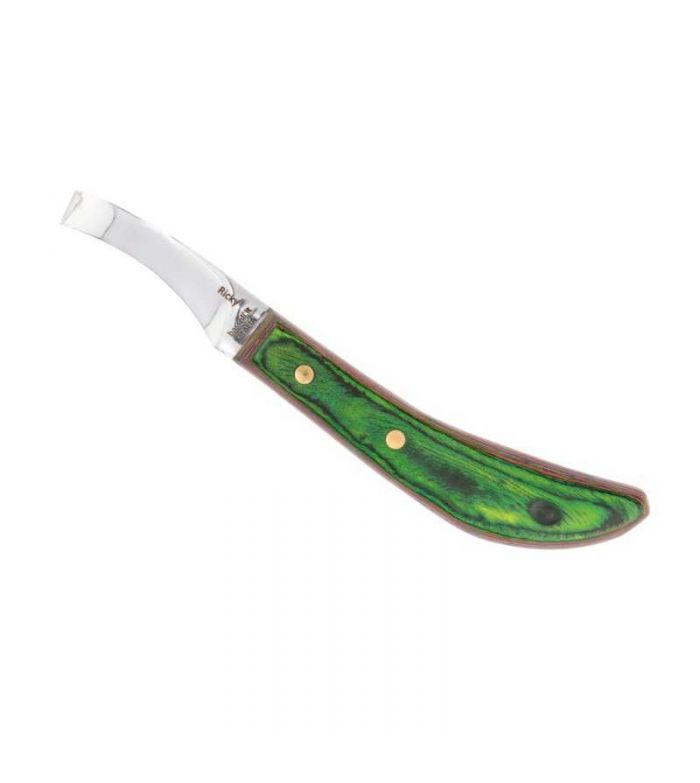 Legra Ricky bassoli, legra Ricky Bassoli para herador con mango verde y multicolor ancho que facilita el trabajo de muñeca mientras se corta el casco. La longitud de la cuchilla es de 70 mm y su longitud total abarca 218 mm. Esta herramienta es muy útil, usada por los herradores permitiendo el cuidado de su animal antes de colocar la herradura.