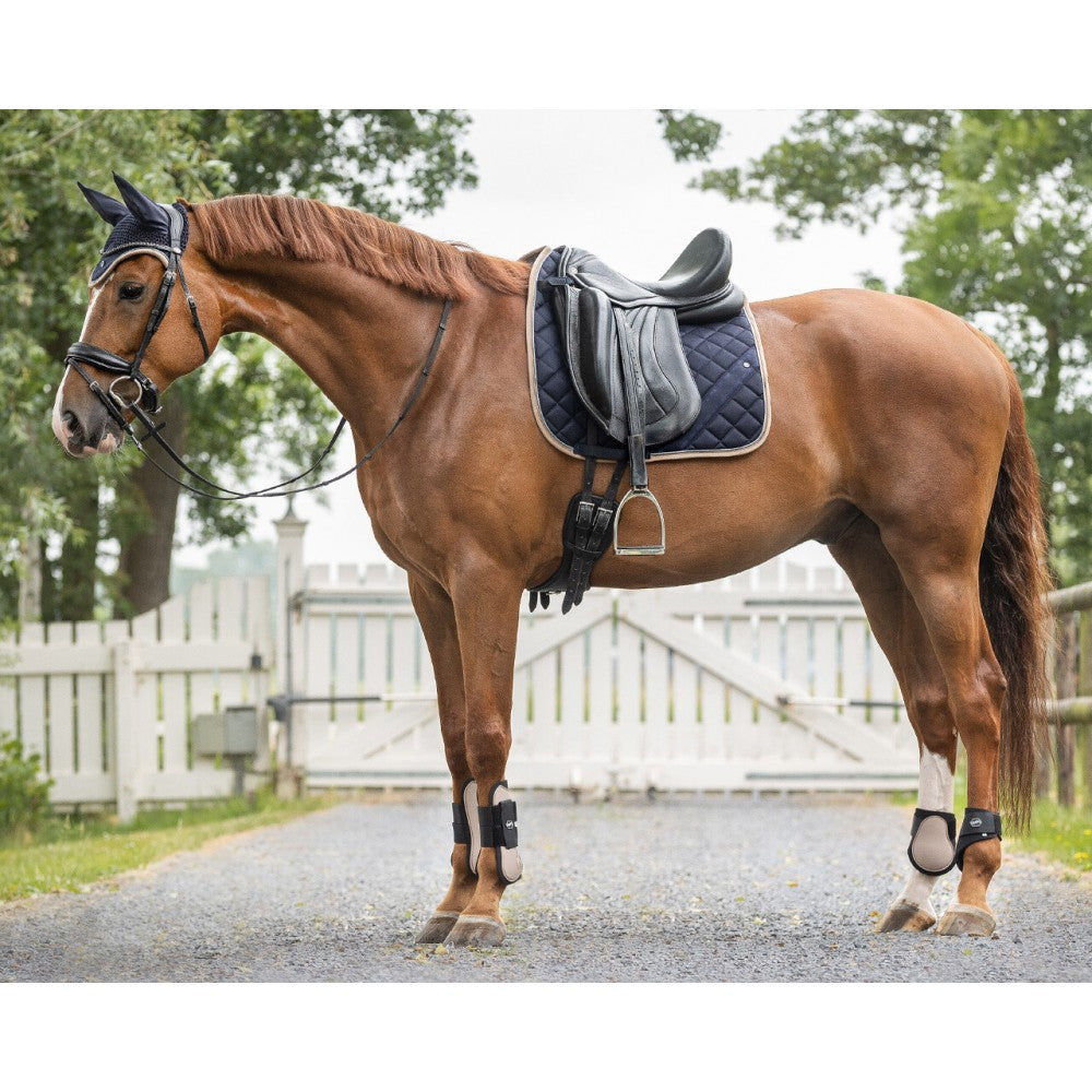 Juego de dos protectores anatómicos abiertos para los posteriores, con carcasa dura y forro de neopreno suave. Cierre de Velcro con logotipo QHP. Protege los posteriores del caballo contra choques y golpes. Disponible en muchos colores.