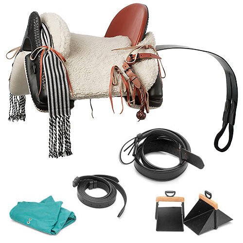 El equipo completo incluye silla, cincha vaquera, baticola, aciones de estribo vaqueras, estribos vaqueros metálicos forrados y acolchados en cuero, porra, manta estribera de lona, baticola, zalea borreguillo sintético, funda de trabajo de lona muy resistente y bolsa de transporte de algodón con asas.